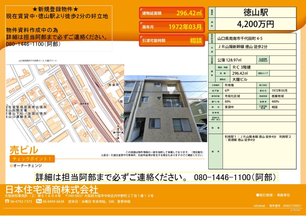 価格4,200万円 種別店舗付住宅 所在地 交通 物件詳細 築年月 新築/中古 面積 計測方式 バルコニー 向き 建物階数 部屋階数 建物構造 間取内容 駐車場 取引態様 引渡/入居時期 現況 周辺環境 設備・条件 物件番号 00008 ※物件掲載内容と現況に相違がある場合は現況を優先と致します。 Author njt_editorPosted on 2025年4月19日2025年4月21日Categories 売買おすすめ物件, 投資おすすめ物件 CONTACT お問い合わせはこちらからお寄せください お電話からのご予約・お問い合わせ TEL 06-6949-6637 営業時間 10:00~19:00 定休日 水曜日 WEBからのご予約・お問い合わせ お問い合わせフォーム この物件についてのお問い合わせはこちらから エラー: コンタクトフォームが見つかりません。
